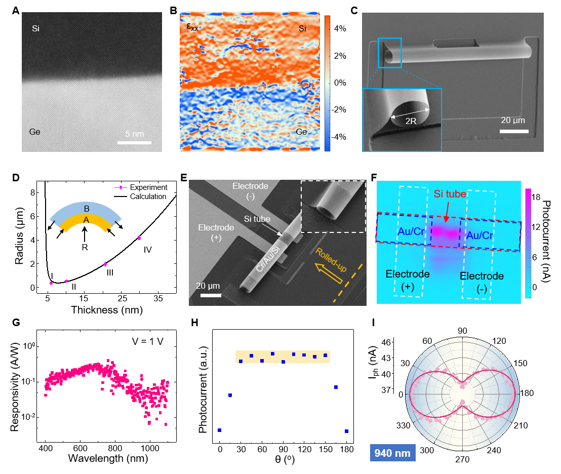 图1:硅锗外延界面的透射电子显微镜图像(A),以及相应的应变分布图(B)。(C) 自卷曲硅纳米薄膜微管的SEM图像。(D)计算的自卷曲硅纳米薄膜微管直径与厚度之间的关系。(E)自卷曲硅纳米薄膜微管光电探测器件的SEM图像。(F)硅微管的光电流mapping。(G)硅纳米薄膜微管探测器在400-1100 nm波段的光电响应。管状硅纳米薄膜器件的广角耦合探测(H)和偏振敏感探测(I)。