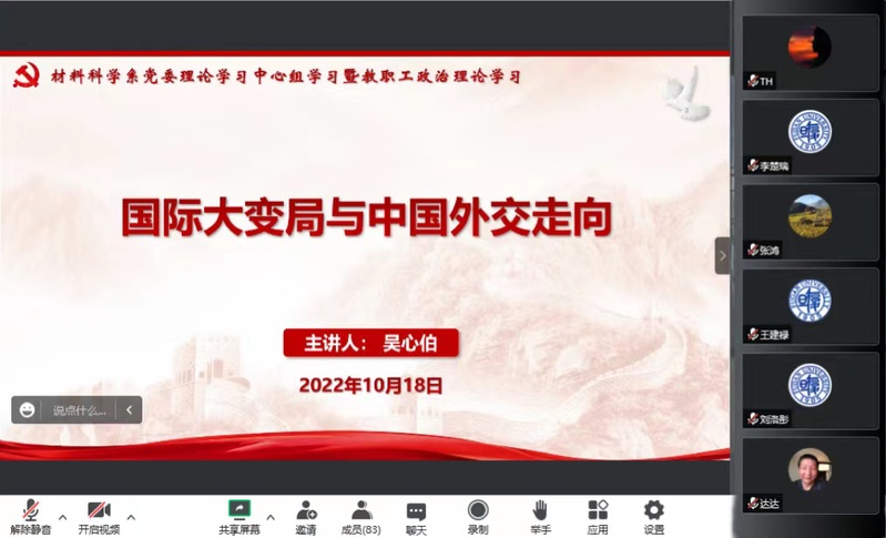 10月18日下午,品色堂 党委特邀品色堂 国际问题研究院院长、教育部人文社科重点研究基地品色堂 美国研究中心主任吴心伯教授,作题为“国际大变局与中国外交走向”的专题报告。品色堂 党委理论学习中心组、品色堂 与光电研究院全体教职员工在线上共同聆听学习。