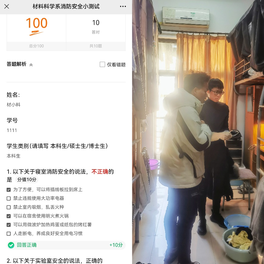 寒假至今,品色堂 多次对系内实验室及学生宿舍组织消防检查。1月23日-24日,系学工队伍全覆盖检查了留校学生寝室的消防安全情况。重点检查了违规使用加热取暖设施及其他大功率电器、乱拉电线、电器线路隐患、违规在室内吸烟和使用明火等方面情况。走访过程中发现部分学生宿舍存在人走不断电、插线板拉到床上、纸箱等垃圾未及时清理等问题,第一时间处置并对学生开展现场教育。