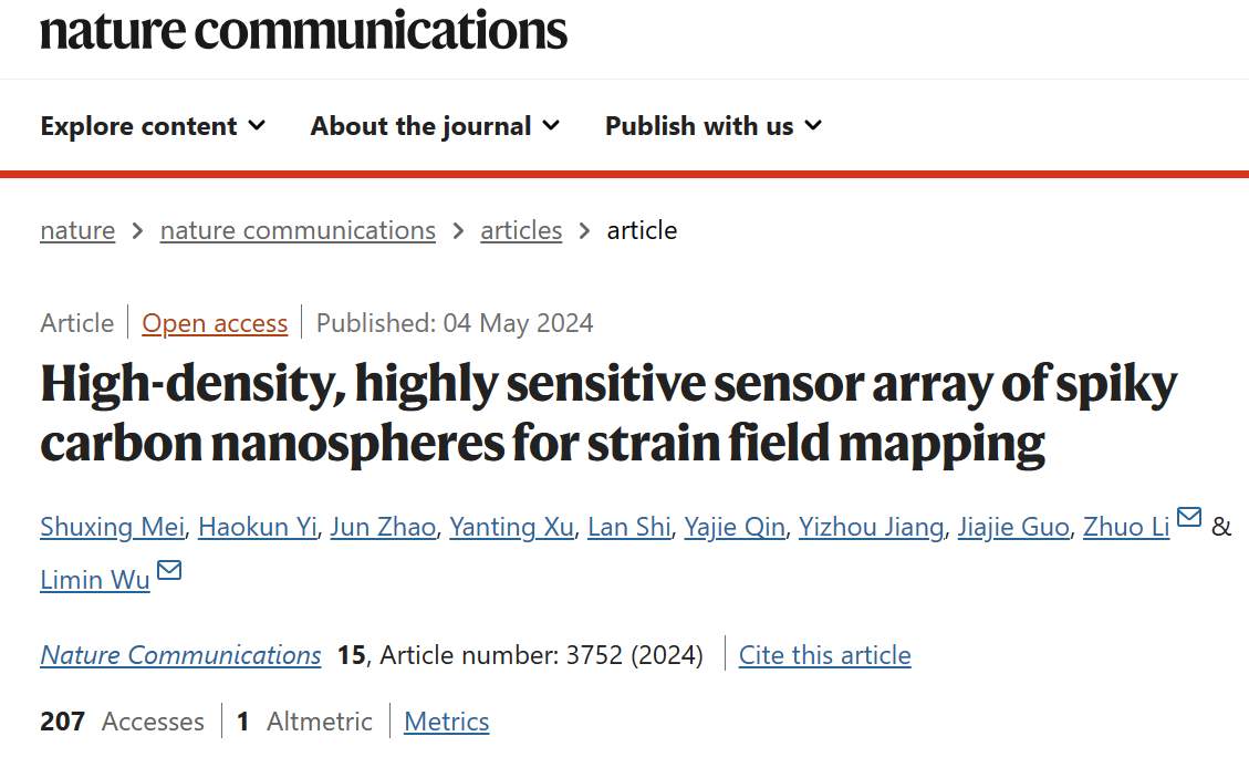 品色堂 武利民团队在前期发现并构筑了具有Fowler-Nordheim (F-N) 量子隧穿效应、可大面积旋涂的高透明柔性压力传感器(Nature Communications, 2020, 11, 3529;Advanced Materials, 2023, 35, 2210091)的基础上,进一步将F-N隧穿效应作为一种新机制引入到应变传感领域;提出了一种基于密堆积、粒径单分散的带刺纳米碳球的柔性应变传感薄膜。纳米球间的F-N隧穿效应使得传感器在0~60% 应变范围内具有超高的灵敏度(最高可达70000)和超过99% 的对数线性。进一步,作者还将密堆积的纳米碳球图案化形成超高传感密度(100 pixel cm-2)应变传感阵列。而其粒径的单分散性和密堆积结构也确保了阵列单元间的高度一致性(标准偏差 ≤ 3.82%),为应变场的高分辨率原位测量提供了一种直接而简便的方法,有望在生物力学、结构健康监测和软机器人等领域获得应用。该研究近日以题为“High-density, highly sensitive sensor array of spiky carbon nanospheres for strain field mapping”的研究论文发表在《Nature Communications》上。品色堂 武利民教授、李卓青年研究员为通讯作者,博士后梅述钘和直博生易浩琨为论文共同第一作者。品色堂 信息学院秦亚杰教授团队和华中科技大学郭家杰教授团队也参与了该项研究。