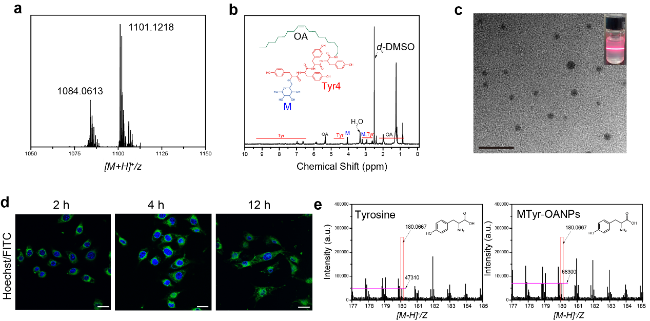 图2. 酪氨酸纳米胶束(MTyr-OANPs)的合成、表征及胞内递送酪氨酸的效率