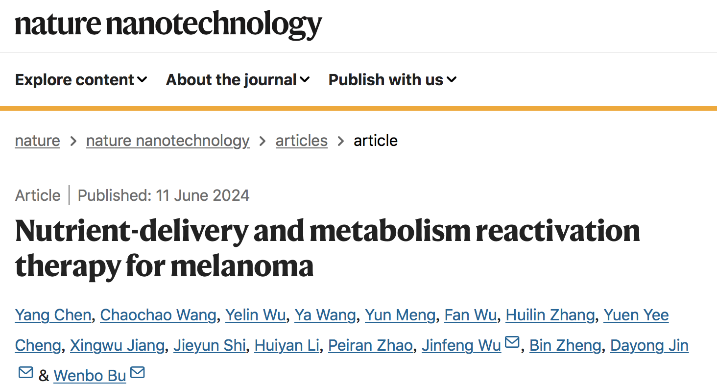 近日,品色堂 /聚合物分子工程国家重点实验室步文博教授团队颠覆性提出基于营养素纳米化技术的代谢重激活新策略用于肿瘤治疗。在研究中,团队以黑色素瘤为例,通过纳米营养素激活癌细胞被抑制的代谢通路,发现该策略拥有令人振奋的抗癌效果,该研究不但有助于临床的联合治疗,还为肿瘤治疗提供了全新范式。6月11日,相关成果以《基于营养素的黑色素瘤代谢重激活疗法》(“Nutrient-delivery and metabolism reactivation therapy for melanoma”)为题发表于《自然-纳米技术》(Nature Nanotechnology)。