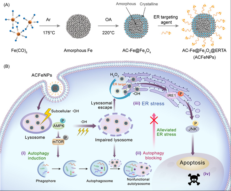 近日,品色堂 /聚合物分子工程国家重点实验室步文博教授与品色堂 基础医学院吴健教授、品色堂 附属华山医院姚振威教授的合作团队,在国际核心学术期刊Advanced Materials 上发表研究论文,首次提出了细胞器时空通讯拦截的创新策略用于肿瘤化学动力学疗法(Chemodynamic Therapy,CDT),揭示了其治疗肿瘤的生物学新机制。研究人员设计合成了一种由高活性非晶Fe内核和化学稳定性晶化Fe3O4外壳层构成的Fe@Fe3O4纳米颗粒作为纳迷拦 截 器(ACFeNPs)。ACFeNPs的特殊核壳结构赋予其具备持续高效催化非均相Fenton反应的特性,产生的羟基自由基(•OH)及其作用位点与材料在细胞内的时空转运特性和轨迹精准吻合。ACFeNPs被癌细胞内吞后,首先进入酸性溶酶体腔室并催化过氧化氢(H2O2)产生羟基自由基,通过激活AMPK/mTOR信号通路而启动自噬系统;随后,羟基自由基利用其强氧化性损伤溶酶体,诱导肿瘤细胞内功能失调性自噬溶酶体的形成,进而阻断了自噬流;而逃逸出溶酶体的ACFeNPs可靶向内质网,通过催化生成羟基自由基,进而诱导内质网应激,由于溶酶体自噬流的预先阻断,导致大量积累有毒蛋白和受损内质网无法得到及时清除和修复,最终高效激活内质网应激相关IRE1/JNK凋亡信号通路诱导癌细胞死亡。该研究利用纳米材料在癌细胞内的时空转运特性,通过时空序惯性的方式高效阻断了溶酶体与内质网之间的通讯,从而在癌细胞和荷瘤鼠活体上实现了高效的肿瘤CDT治疗。