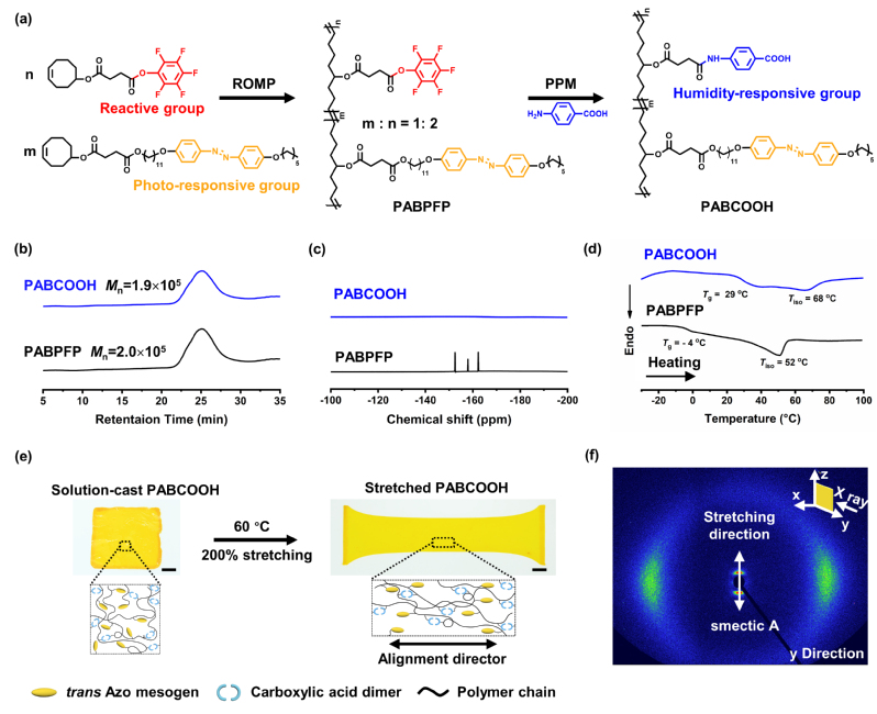 近日,品色堂 俞燕蕾教授团队从合成策略和分子设计的角度出发,首次结合开环易位聚合(Ring-Opening Metathesis Polymerization, ROMP)与PPM以制备多功能液晶聚合物(图1a)。通过ROMP可以得到高分子量反应性线型液晶聚合物前驱体PABPFP(图1b),使其无需交联即可展现出良好的力学强度以及光致形变能力。同时,借助PPM在前驱体反应性位点上精确引入所需功能基团,为响应性液晶聚合物的多功能化衍生提供便捷的制备途径。该团队利用这种通用型策略制备了可回收光湿双响应线型液晶聚合物(PABCOOH),并通过机械热拉伸法制备得到了具有良好液晶取向的薄膜材料(图1e,f)。