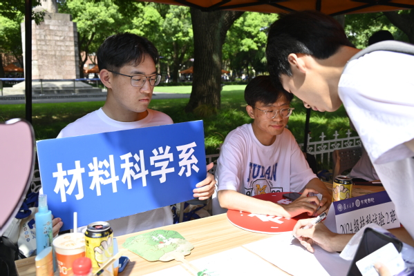为了让迎新工作更加高效和顺畅,辅导员和迎新志愿者团队早早地到达了指定的摊位。他们精心布置迎新现场,营造出温馨而热烈的氛围,耐心引导和有序组织新生办理各种报到手续。系里为新生们准备了“微结构摄影大赛”定制款凉扇、系宠“匠匠”手办、特色帆布袋、系名钥匙扣等特色文创,受到了新生们的喜爱。