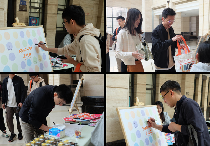 为了欢迎学长学姐们归校,课题组同学们自己设计了签到板,并邀请学长学姐们留下笑脸和签名。除了各式各样的茶品点心以外,还精心准备了订制的纪念品,希望学长学姐们回忆在课题组快乐时光的同时,还能经常记得回来看看。