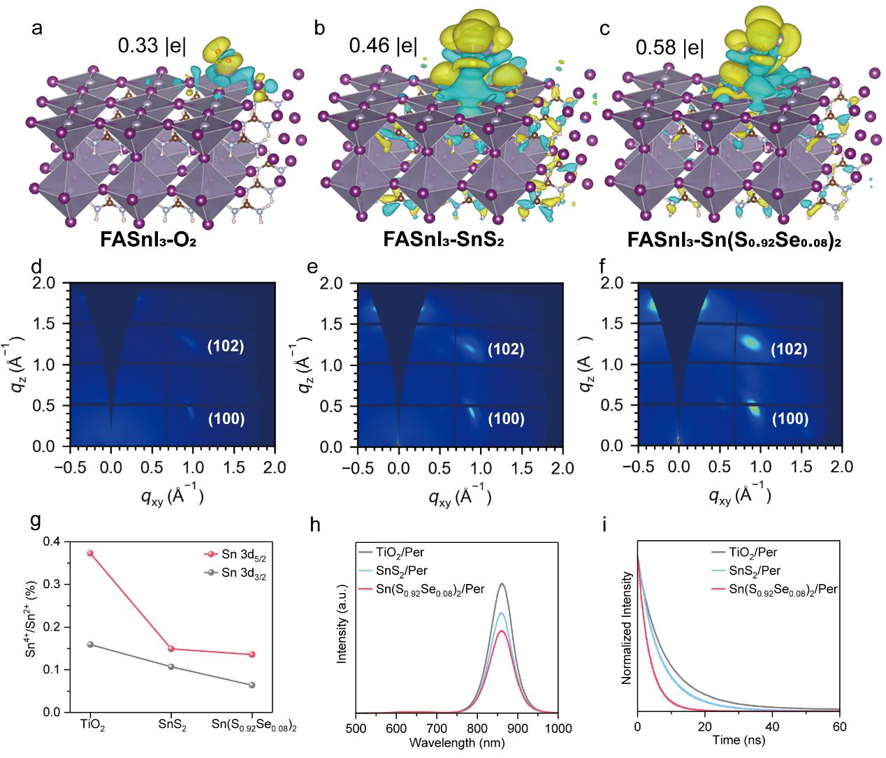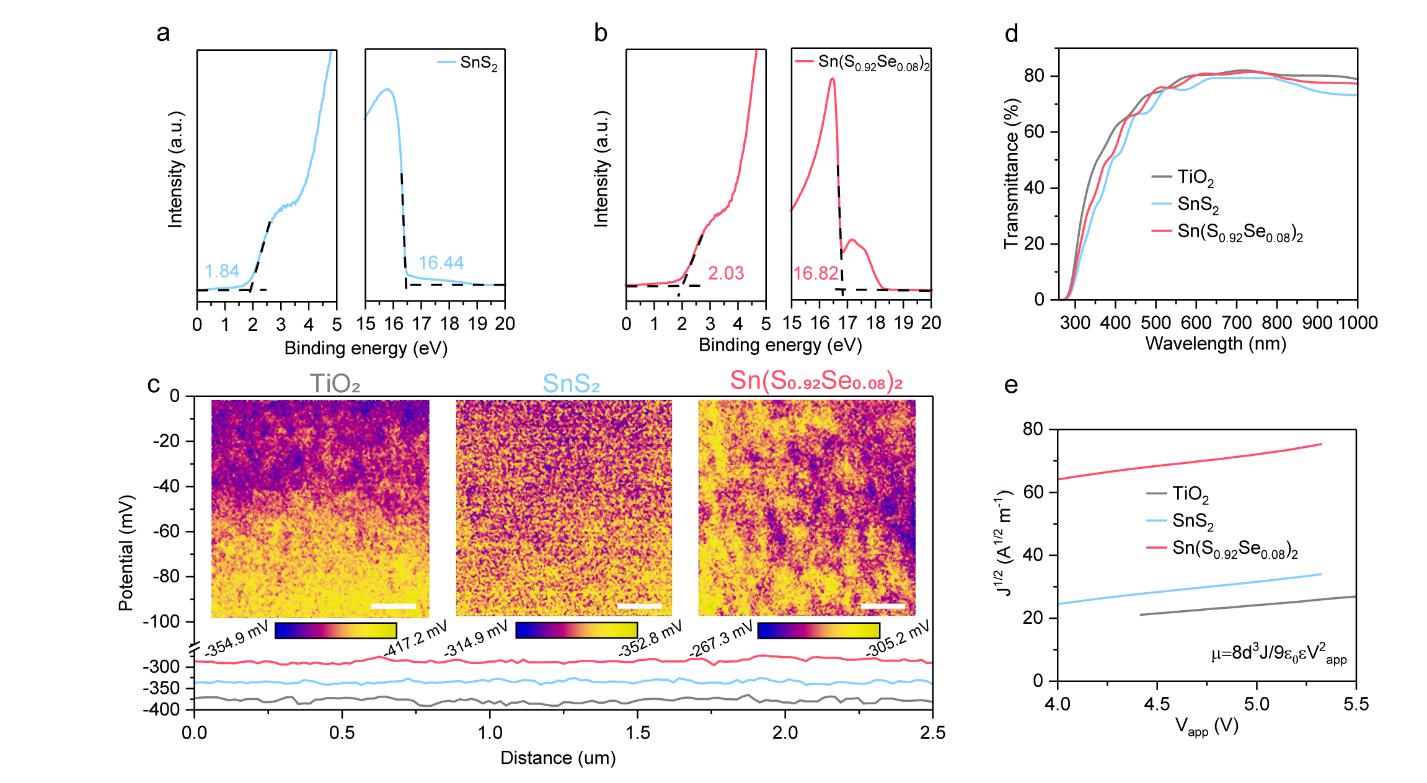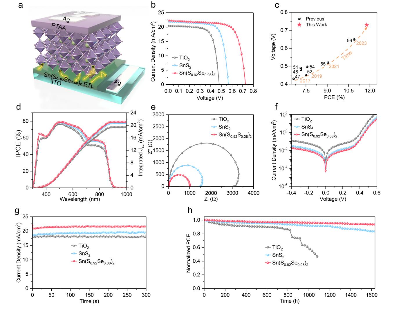该研究不仅揭示了金属氧化物电子传输层影响光电性能的潜在机制,还为未来TPSCs的产业化提供了有力的技术支撑。首先,课题组证实了氧分子从TiO2中的氧空位中解析的过程,并且原位跟踪了锡基钙钛矿中Sn2+转化为Sn4+的过程(图1)。其次,研究还证明了TiO2电子传输层较深的能级结构,并通过实验和理论分析明确指出,深能级是导致较低VOC的主要原因。为此,课题组在TPSCs中引入了金属硫族化合物Sn(S0.92Se0.08)2电子传输层。该材料不仅避免了氧分子解吸,还拥有更浅的导带底、优异的表面形貌、更高的导电性及更强的电子迁移率(图2)。