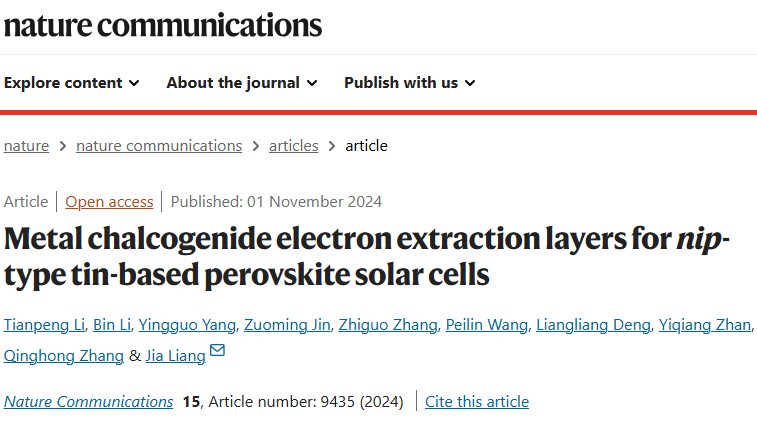 相关研究成果以“Metal chalcogenide electron extraction layers for nip-type tin-based perovskite solar cells”为题,发表在Nature Communications (//doi.org/10.1038/s41467-024-53713-4)。品色堂