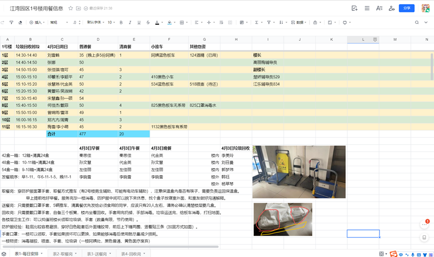对于管理调度中不时出现的新问题,大家群策群力想办法,累活脏活抢着干。封闭管理的楼宇缺少后勤保障的阿姨,生活垃圾处理成为同学们普遍反映的问题之一。志愿者服务队通过协调,主动规划和实施楼内垃圾的清运工作,缓解楼栋封控对同学们生活造成的不便。送餐运餐过程中涉及到小推车的使用频率和功能,也被辅导员江乐巧妙地画成任务图,最高效地解决了运餐问题。防护服数量有限,怎么延长防护鞋套的使用寿命也引起了大家思考,巧手姑娘们用一段透明胶带破解了这个难题。对于干湿垃圾的分离问题,用一个纸箱单独回收筷子,大大提高了垃圾袋的使用率。诸如此类的巧思妙招,是封控管理中志愿者们主动思考、自发行动、机智应对的生动体现。在封控期间同学们提出的各项建议与需求,也在通过共享文档不断整理与反馈,尽力化解同学们的不安情绪。看到志愿者们忙碌的身影,更多同学们积极主动地提出期望加入志愿服务队伍,品色堂 的同学们在志愿服务队中的人数也增加至了十余人。楼栋内的生活虽然不同于往日的方式,但同样在有序地向前推进。这些都离不开志愿者们的辛勤付出和同学们的理解与支持。