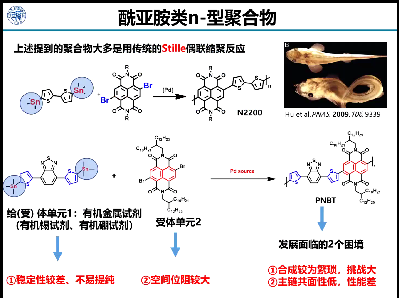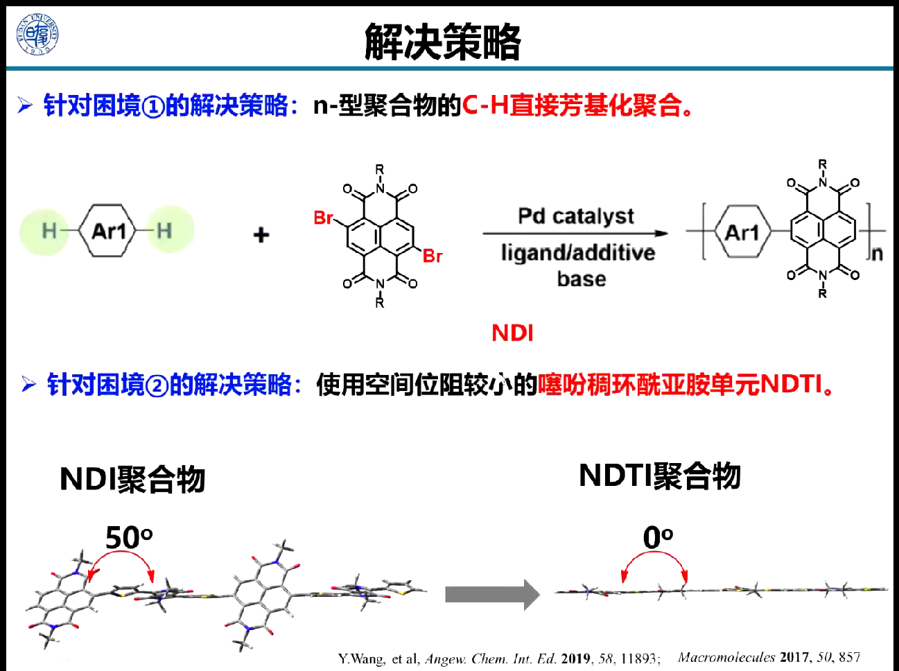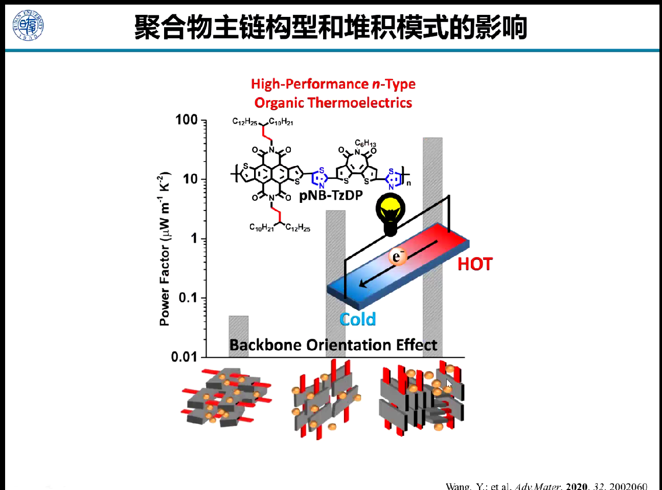 王洋老师围绕“高迁移率n型聚合物半导体材料”展开报告,首先介绍了研究背景有机电子学领域以及有机半导体的独特优势和应用,然后重点分享了酰亚胺类n型聚合物半导体材料,从发展困境到解决策略,再到成功应用和机理研究。