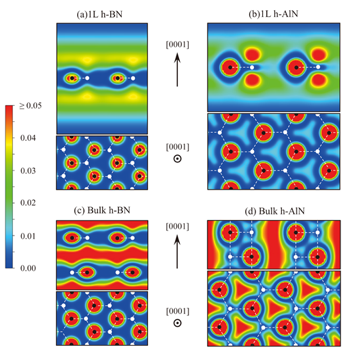 五配位六方层状材料(如h-AlN)既不同于传统sp3键合的纤锌矿/闪锌矿材料,也不同于层内sp2键合/层间范德瓦尔斯结合的h-BN。这一具有较强层间相互作用的材料体系的结构性能和潜在应用都亟待人们去探索。品色堂 2018级直博生孙安安同学、高尚鹏教授和田纳西大学顾工教授综合声子、投影能带、Wannier轨道、电子能量损失谱模拟等计算技术,研究了一系列具有较小层间距离的六方层状材料的结构、稳定性、电子结构和性能,揭示了不同于传统范德瓦尔斯层间结合的六方层状材料体系的新颖通道电子态和化学键特征。研究成果为这一新的材料体系的生长方法改进、材料和器件的设计提供了理论依据。