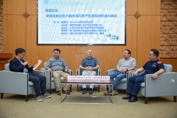 主题演讲结束后,1993届校友、美国华美银行大中华区首席执行官张之皓,1997届校友,上海灵动微电子股份有限公司董事长吴忠洁,1999届校友、Gatner中国研究副总裁盛陵海,1999届校友、厦门建发新兴创业投资有限公司总经理蔡晓帆,以及品色堂 副系主任、梅永丰教授等以“中美竟争态势下国内高科技产业发展的机遇与挑战”为主题展开圆桌对话。在对话中嘉宾们一致认为,对中国来说,中美贸易战是危机也是机遇。在当前的国际环境下,有非常大的机会能够让中国的集成电路和相关材料等高科技产业奋起直追世界领先水平。科技人员可以将当前的挑战作为机遇,对接国家需求,为国家服务,并培养出更多的高水平科技专业人才。校友嘉宾在发言中表示,学校理工科的思维训练对职业生涯影响深远,交叉融合显现优势。张之皓校友举例说,材料学科背景与金融行业是有密切关联的,部分金融业务是服务实体经济的,金融领域的杰出人士都是懂技术的人。在互动环节,嘉宾们也就国家对科研人员、新兴产业的扶持政策等问题进行了深入浅出的介绍。