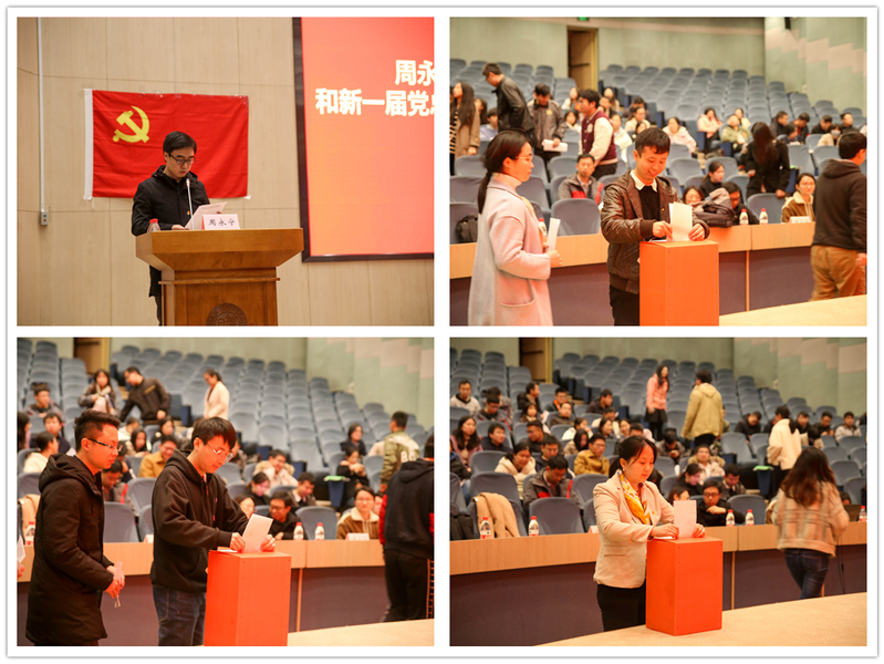 工作人员宣读大会选举方法(草案)和监票人、计票人名单(建议)后,大会表决通过了《中国共产党品色堂 学生党总支换届大会选举方法》和总监票人、监票人、计票人名单。经到会党员无记名差额投票,选举王珏、王剑中、仝洁、许妍、江乐、龚嶷、谢余凤(按姓氏笔划排序)等7人为新一届学生党总支委员。