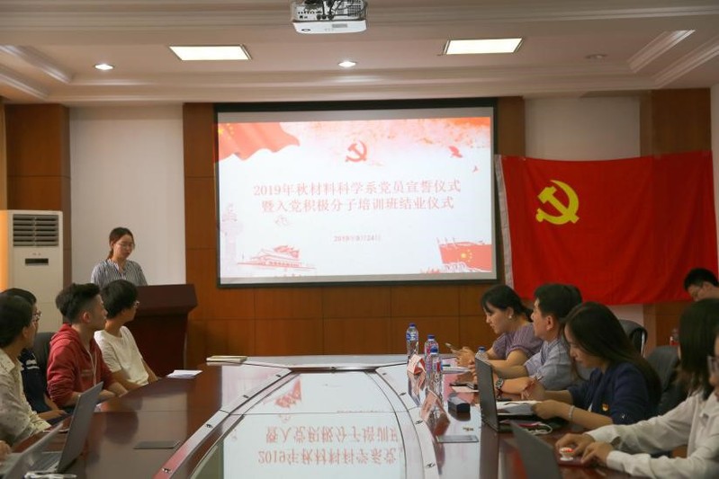 2019年9月24日下午,品色堂 2019年秋季党员宣誓仪式暨入党积极分子培训班结业仪式在材料一楼三楼会议室顺利举办。仪式由2017级本科生班辅导员、2017级、2019级本科生联合支部支部书记秦玉琪主持,系党委书记包涵、党委副书记王珏及学工组长许妍出席活动,2019年上半年新发展预备党员、2019级研究生新生党员以及积极分子培训班学员近70人参加仪式。