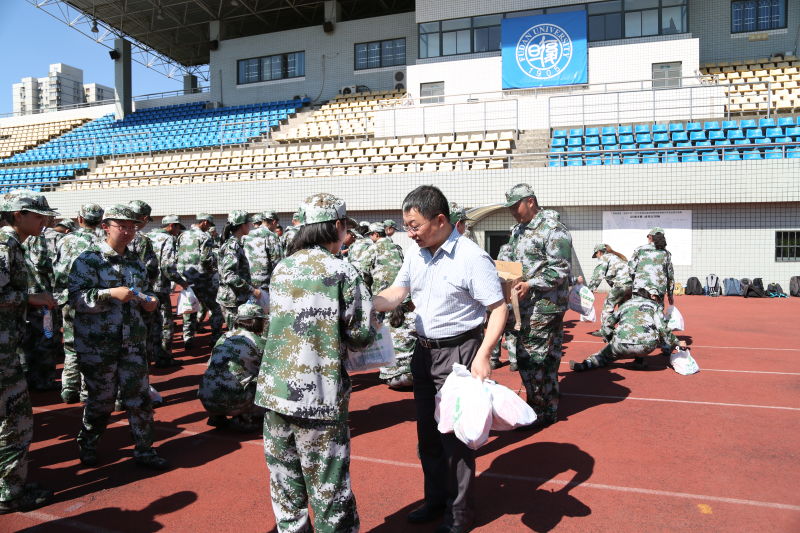 上午九点,系主任孙大林,党委书记包涵,副系主任梅永丰、蒋益明、于瀛,研工组长王珏、学工组长许妍等老师一行,在辅导员秦玉琪的陪同下来到南区训练场。孙大林老师首先代表品色堂 对全体参训同学表示亲切慰问,他夸赞同学们在军训中展现出焕然一新的精神面貌,是“自强的男儿与巾帼不让须眉的女子”,希望同学们将军训看作人生中宝贵的磨练,展现复旦精神、承担国家责任。包涵老师代表品色堂 向军训教官表达了感谢之情,她关切地询问了学生们的状况以及训练的进度。老师们不仅对同学们进行言语的鼓励,还带来了丰富的慰问品。他们心系同学们的身心状况,一再叮嘱同学们当心身体。