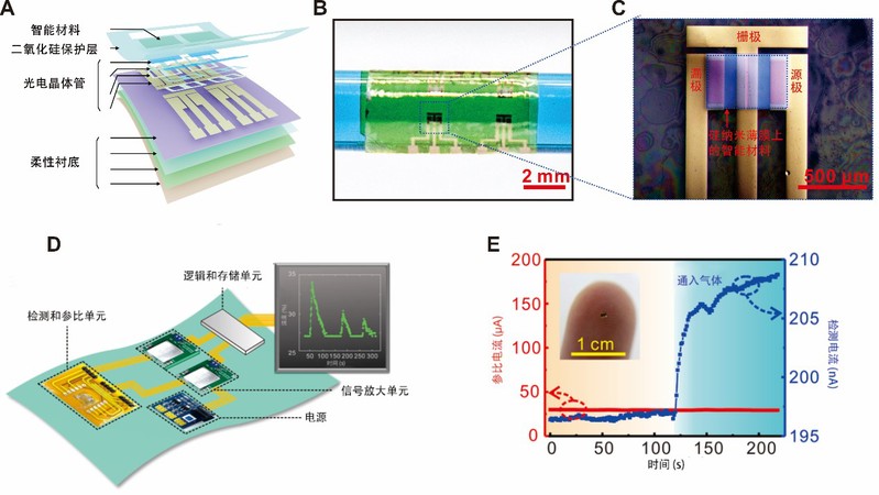 图1:(A) 器件主要功能层示意图;(B) 贴附于曲面上的柔性传感器件阵列;(C) 智能传感器件功能区的光学显微照片;(D)用于湿度传感的集成系统构造图;(E) 氢气通入前后参比器件与检测器件的电流变化,红色为参比电流,蓝色为检测电流。