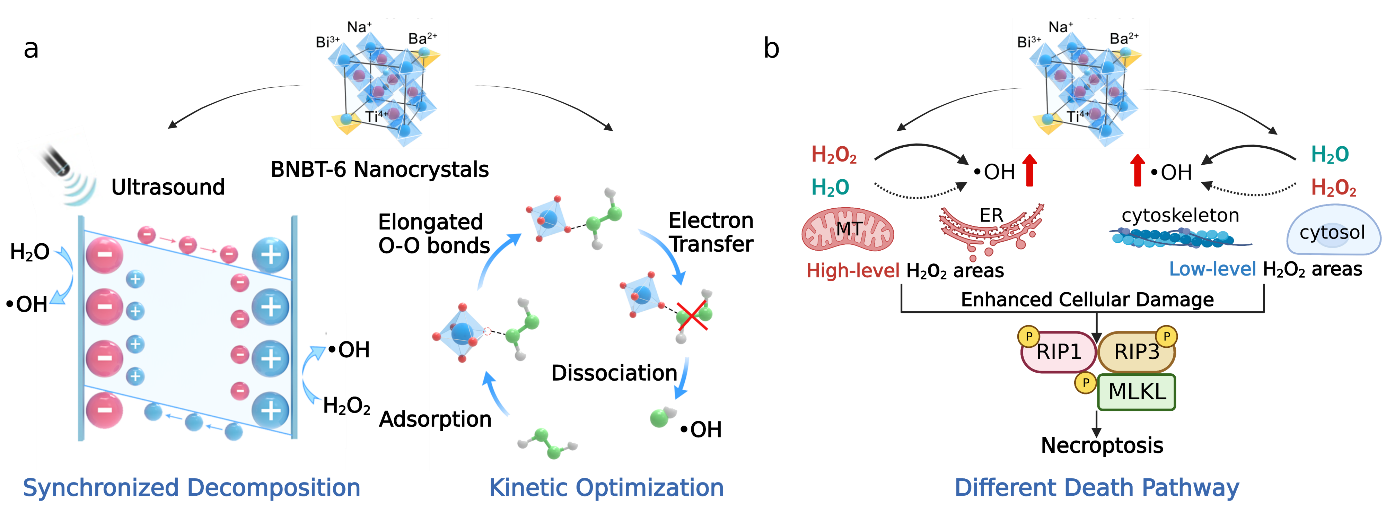 近日,品色堂 品色堂 /聚合物分子工程国家重点实验室步文博教授、品色堂 附属华东医院郑向鹏教授和同济大学附属第十人民医院吴叶林研究员的合作团队,创新性地提出了构建“非金属芬顿活性中心”用于肿瘤化学动力学疗法的新策略,为解决上述瓶颈问题提供了新的机遇。采用改进的皮其尼柠檬酸盐凝胶法,制备了一系列基于钙钛矿结构的钡元素掺杂钛酸铋钠(Bi0.5-xNa0.5BaxTiO3-0.5x,BNBT-X)压电纳米晶体,利用低价Ba2+取代Bi3+的受主掺杂技术,可在BNBT-X晶体内巧妙构筑氧空位缺陷。值得关注的是,带正电的氧空位可以增强电子局域富集作用,成为催化过氧键断裂的活性位点,即为“非金属芬顿活性中心”。首先,利用医用超声波可引起压力变化的特性,诱导BNBT-X的晶体结构发生变化,通过调控材料内部的极化状态而形成内建电场。继而,内建电场可推动材料内部电子(e-)和空穴(h+)的高效分离,其中,电子可以向H2O2的过氧键转移而生成OH(H2O2 + H+ + e-OH + H2O),提升材料催化分解H2O2生成OH的类芬顿反应活性,巧妙规避了高价态过渡金属还原为低价态这一经典芬顿反应过程的限速步;同时,分离的空穴可以氧化H2O生成OH(H2O + h+OH + H+),通过利用细胞内分布最为广泛的H2O作为OH的额外来源,解决了传统CDT纳米药物在癌细胞内低H2O2浓度区域产生OH效率低的瓶颈。实验结果表明,BNBT-6中构筑的氧空位可有效降低H2O2和H2O的解离能,赋予了材料在超声波激发下显著提升癌细胞全域内OH产率的能力,加剧了癌细胞的氧化应激,并可激活一种独特的细胞程序性死亡路径(坏死性凋亡),实现了对癌细胞的高效杀伤。