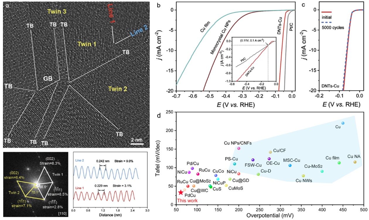 图(a)DNTs-Cu的畸变纳米孪晶结构;(b)DNTs-Cu的析氢催化性能;(c)DNTs-Cu的催化稳定性;(d)DNTs-Cu与其他已报道Cu基催化剂的催化性能对比。