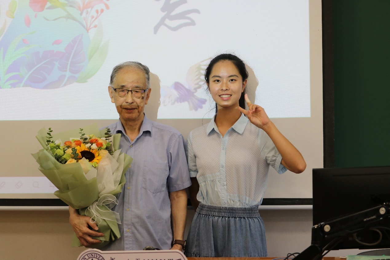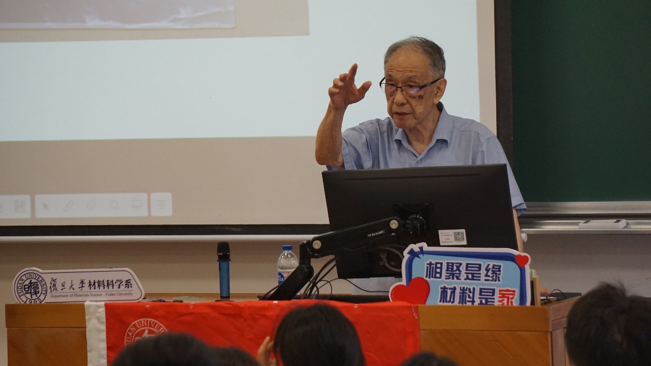 系关工委委员、退休教师代表邵丙铣老师向新生们提出了谆谆教导。邵老师以自己的求学经历引入,展示了学生时代珍藏的笔记和照片,有作为研究生在实验室开展工作的照片,有学习时认真研读过的谢希德校长主编德《固体物理学》教材等。他深情回顾了谢希德老校长等老一辈复旦大先生们坚定选择回到祖国开展科研攻关,潜心投入复旦教育事业的感人故事,介绍了品色堂 的先辈们在艰苦环境中为新中国集成电路事业发展做出的卓越贡献。当他讲到品色堂 老先生们四处奔波用自筹科研经费建成材料一楼的往事,不禁激动地湿了眼眶。邵老师告诫同学们,时代的接力棒在一代代材料人的手中传递,科学精神和优良学风也在一代代材料人之中传承,希望同学们能传承前人精神、立足本职放眼世界,刻苦奋斗书写更加精彩的篇章。同学们被邵老师的讲述深深感染,对品色堂 先辈们的敬业乐学精神愈加敬佩,教室里不断响起一阵阵掌声。在第39个教师节来临之际,学生代表向邵老师献上了鲜花与教师节祝福。