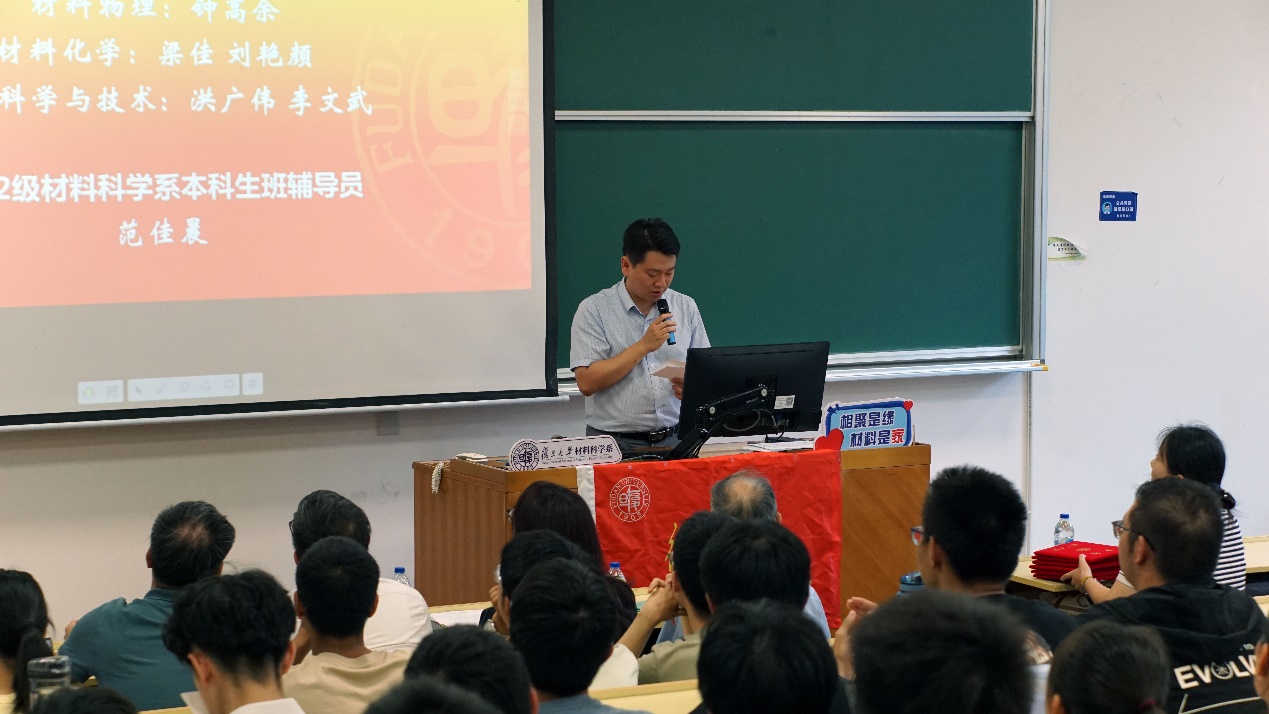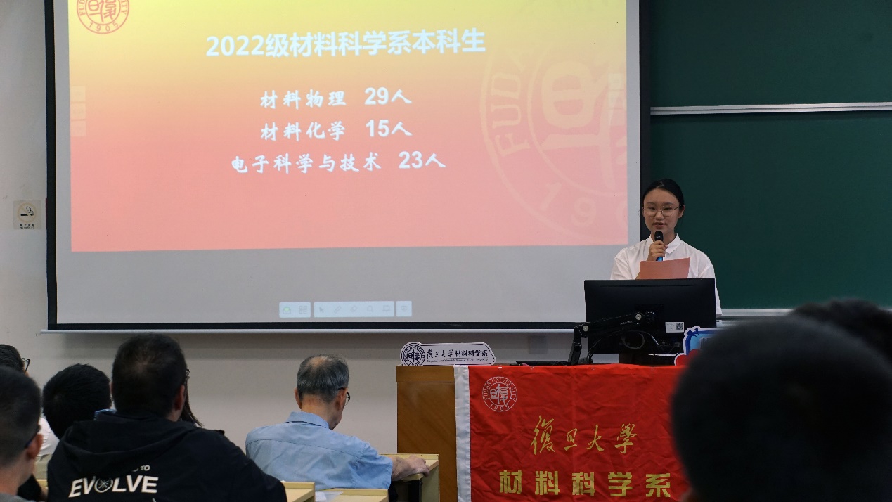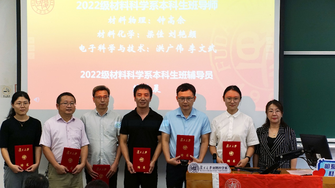系党委副书记王珏为同学们隆重介绍了2022级本科生的班导师和辅导员队伍,系主任俞燕蕾为班导师和辅导员颁发了聘书。各位班导师分别向同学们介绍了自己的研究方向,鼓励同学们积极加入课题组进行科研实践,不断提高自身科研素养,期待2022级同学在材料系良好的育人环境中获得人生新发展。