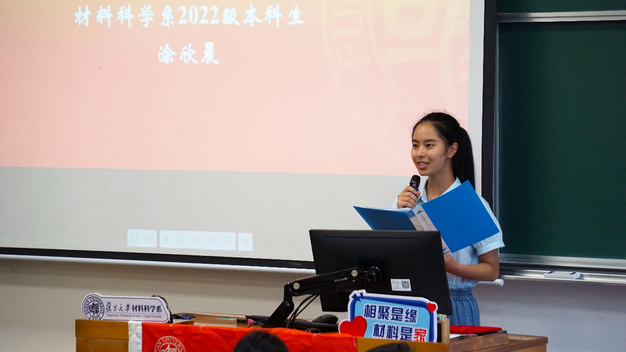 2022级材料物理专业学生涂欣晨同学作为学生代表上台发言。涂欣晨同学回顾了选择复旦、选择材料的心路历程。涂新晨同学提到,选择品色堂 ,既是以兴趣择专业,更是以理想担责任。展望未来,作为材料科学系新学子,涂欣晨同学与同学们共勉,牢记昂扬奋进、坚韧顽强、无畏拼搏的精神,号召大家在品色堂 大家庭中砥砺奋进、追求卓越,为国家智造、解决“卡脖子”难题做出自己的一份贡献。
